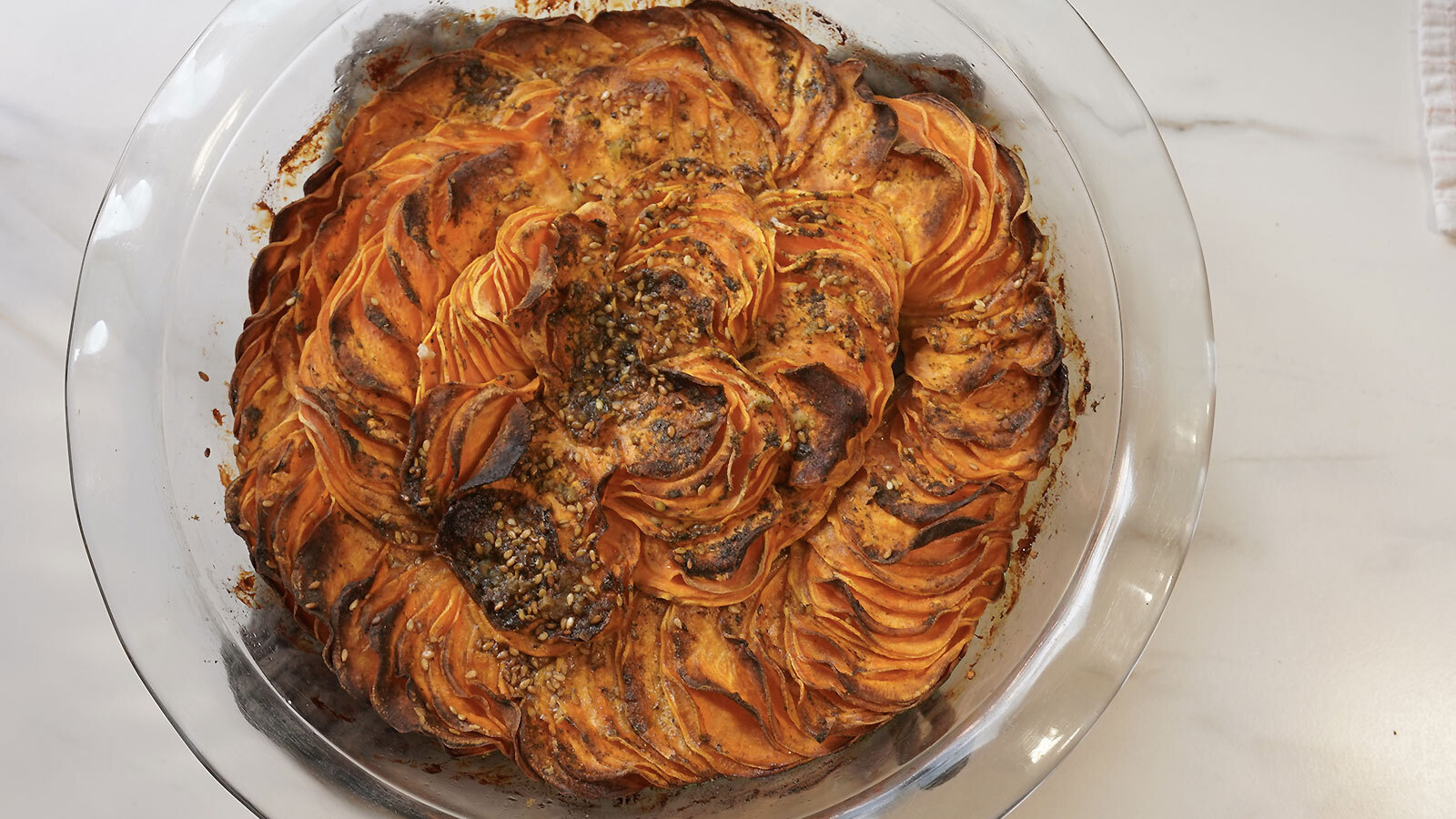 Una versión sencilla y deliciosa del clásico ratatouille, con camote, cebolla caramelizada y el toque aromático del za’atar.